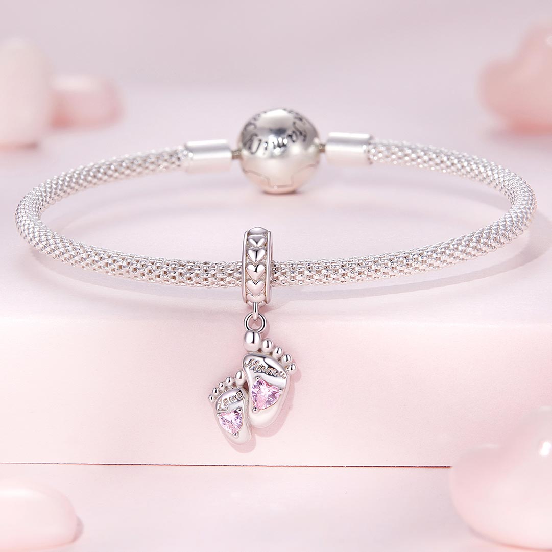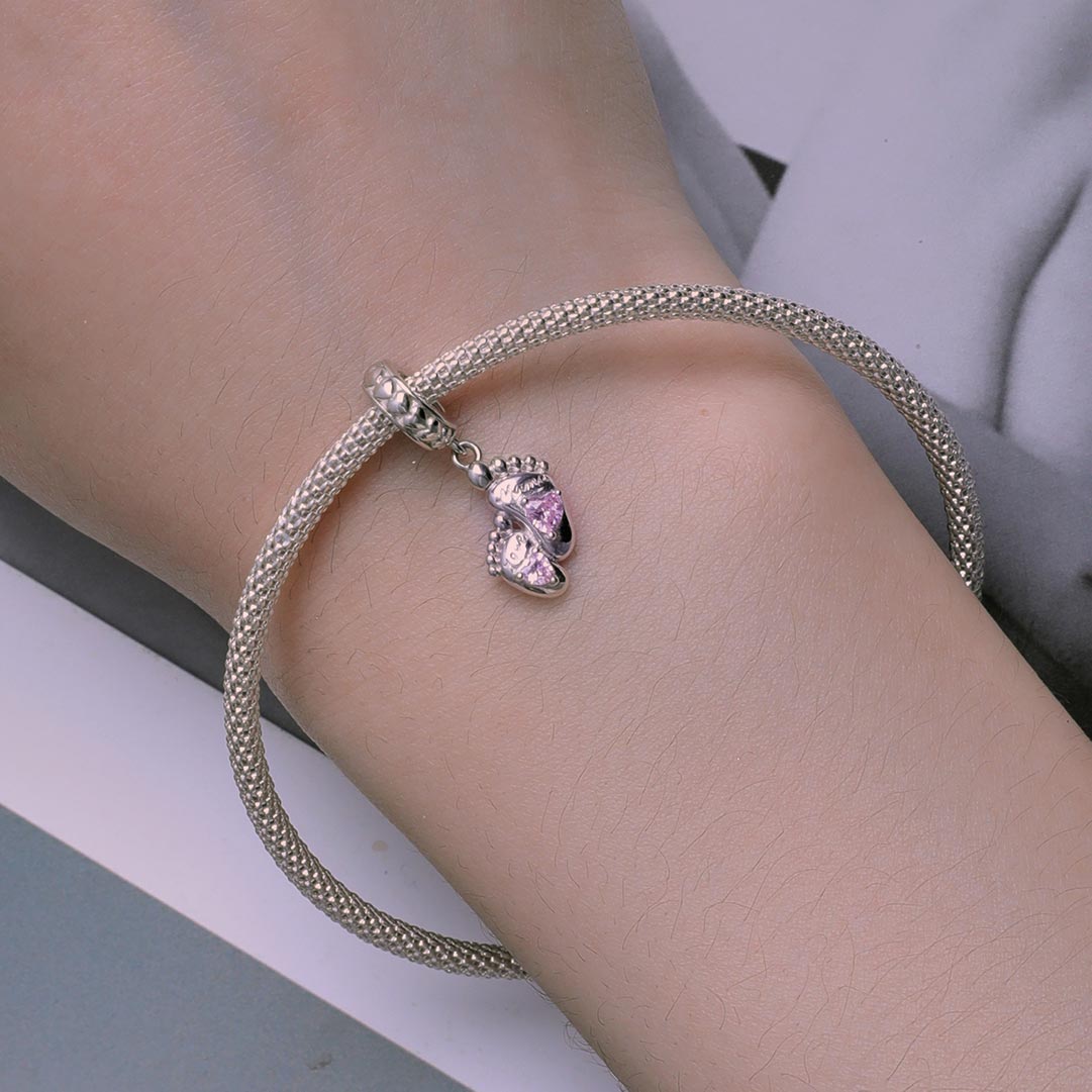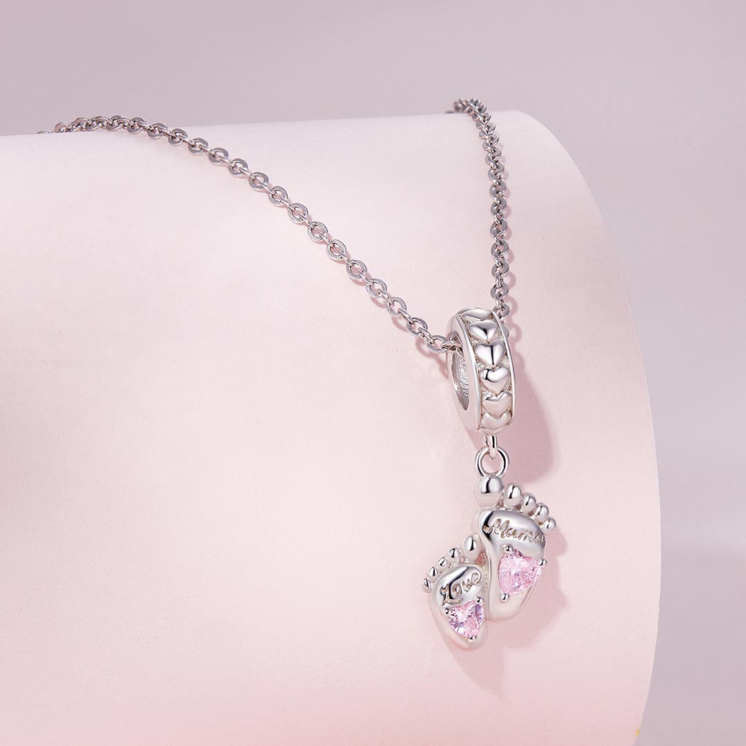A baba lábnyom charm a legédesebb emlékékszer minden anyukának. A medálon két apró babalábnyom látható, melyek a kicsi első lépéseit és a köztetek lévő örök köteléket jelképezik. A talpacskákon ragyogó, rózsaszín szív alakú kövek csillognak, finom, látványos csillogást adva a charmnak.