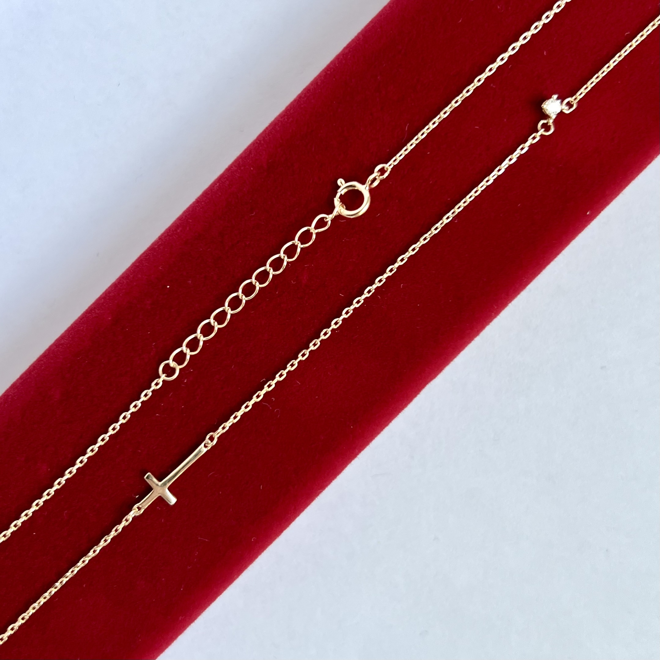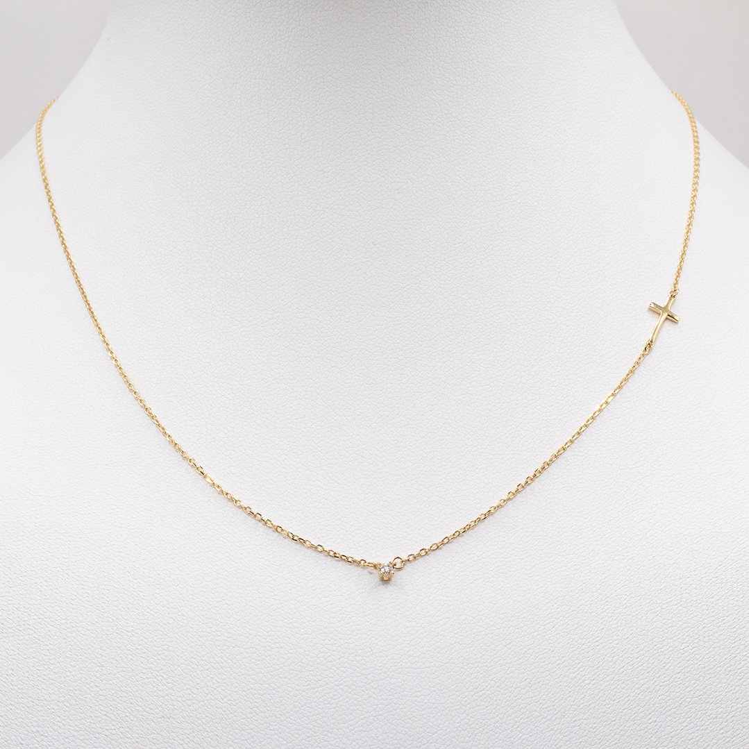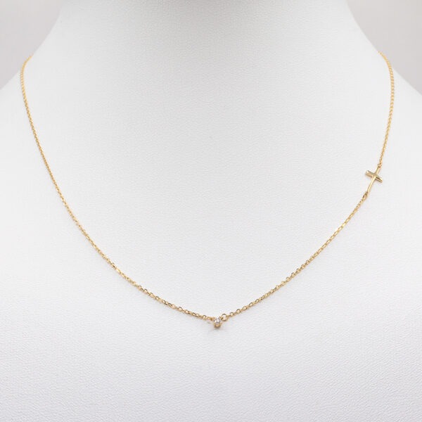 Ez a 14 karátos (585‰) sárga arany női nyaklánc finom szemű láncból áll, amelyet két letisztult motívum díszít: oldalra helyezett, minimalista kereszt és egy apró, csillogó fehér köves dísz. Az aszimmetrikus elrendezés modern, könnyed megjelenést ad, miközben a kereszt szimbolikája diszkréten jelenik meg.